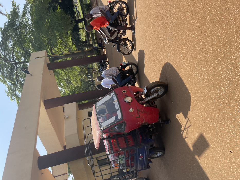 The image depicts an outdoor scene in Makurdi, Nigeria, under direct sunlight, characterized by a light brown, textured ground surface and distinct shadows. In the mid-ground, a worn, red three-wheeled motor tricycle with a blue cargo bed is present. The cargo bed is heavily loaded with multiple plastic crates, each containing bottled beverages, including identifiable Coca-Cola products. A person, dressed in dark trousers and shoes, is partially visible near the front wheel of the tricycle, appearing to be standing. To the right of the tricycle, a black moped with silver-spoked wheels is occupied by two male individuals. The driver wears an orange short-sleeved shirt and dark shorts, with dark sandals. The passenger wears a grey short-sleeved shirt and blue jeans. Slightly behind these individuals, another male wearing a white plaid short-sleeved shirt and blue jeans is seated on a dark-colored motorcycle. The background consists of a beige-colored building structure featuring prominent dark brown support pillars and an overhead beam, suggesting an entrance or architectural facade. Beyond this structure, dense green foliage from mature trees is visible against a clear blue sky. A dark-colored motorcycle is also partially visible parked in the far background among the trees.