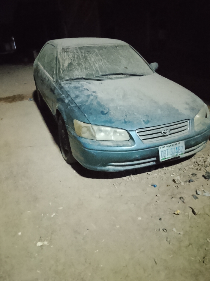 A teal Toyota Camry is heavily coated in dust, obscuring its features. The car's windshield, hood, and roof are almost entirely covered. Its license plate reads "TIO KANO 9 DBT 374BZ." The vehicle sits on a dirt surface with debris scattered around it. It appears to be nighttime.