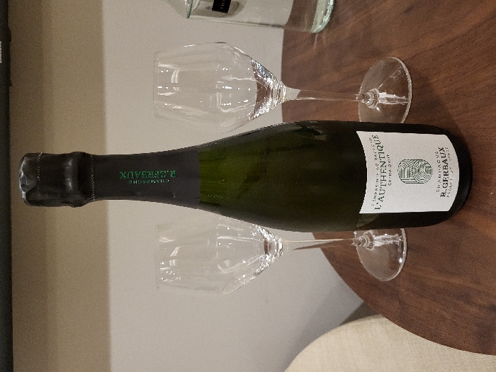 A champagne bottle, labeled "Champagne R. Gerbaux L'Authentique Extra Brut," lies horizontally on a wooden table. Two empty champagne flutes flank the bottle. Another bottle, possibly of water, is partially visible in the background. The scene is set against a neutral wall, and a cushion peeks into the frame on the bottom right.