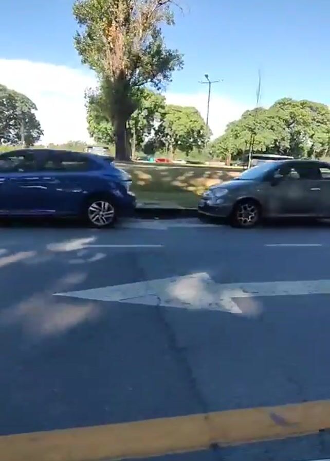 view from inside a vehicle, likely a car or bus, traveling along a city street on a sunny day. The street is lined with parked cars on one side, and a grassy median strip with trees and lamp posts separates the road from another lane of traffic. The sky is blue with some clouds. The camera focuses on the parked vehicles as the vehicle moves, briefly capturing different car models and colors. The road is asphalt with cracks.