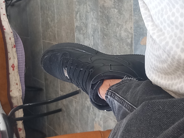 The image displays a close-up, low-angle perspective of an individual's lower left leg and foot within an indoor environment. The person wears a black Nike Air Force 1 sneaker, notable for its scuffed surface and visible AF1 metal dubrae on the laces, paired with dark grey or black distressed denim jeans featuring a frayed cuff that exposes the ankle. The leg rests adjacent to a light-colored fabric patterned with small, repeating grey ovals on a white background. The flooring consists of large, rectangular grey tiles. In the background, a black metal stool leg is partially visible. Further back, a brown wooden edge, likely part of furniture such as a bed or sofa, is draped with two distinct fabrics: an upper layer with white and small red floral patterns, and a lower layer of light purple material. The image provides no discernible visual cues to identify a specific location within the city of Tbilisi, Georgia.