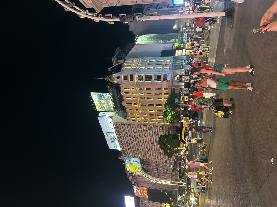 A nighttime street scene features tall buildings illuminated with lights and advertisements. People are walking on the sidewalk and standing on the street. There is a scooter near a group of people. A couple is standing near the center of the frame, with one wearing a white shirt and green shorts, and the other wearing a red shirt and denim shorts. In the upper right corner, a person is holding a cell phone.