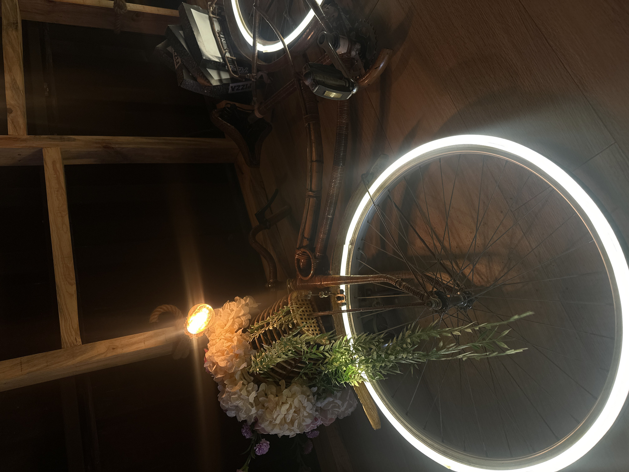 An antique-style bicycle, modified for decorative display, is positioned indoors in a dimly lit environment. The bicycle features a frame and handlebars wrapped in a brown, woven material resembling rattan. Both wheel rims are illuminated by continuous white LED strips. A single, prominent incandescent-style bulb, emitting a warm orange-yellow light, is mounted at the front, positioned above a woven basket. This basket contains a dense arrangement of artificial flowers, predominantly large white and light pink hydrangeas, along with long, trailing strands of green artificial foliage. The bicycle rests on a light brown wooden plank floor. In the background, dark wooden beams form a visible structural framework, and a segment of thick coiled rope is wrapped around one beam near the front light. To the right, adjacent to the rear wheel, several stacked rectangular cardboard boxes are visible, with one clearly displaying the word "PIZZA." No individuals are present. The visual information does not provide specific details to identify the location within the city of Valencia, Venezuela.