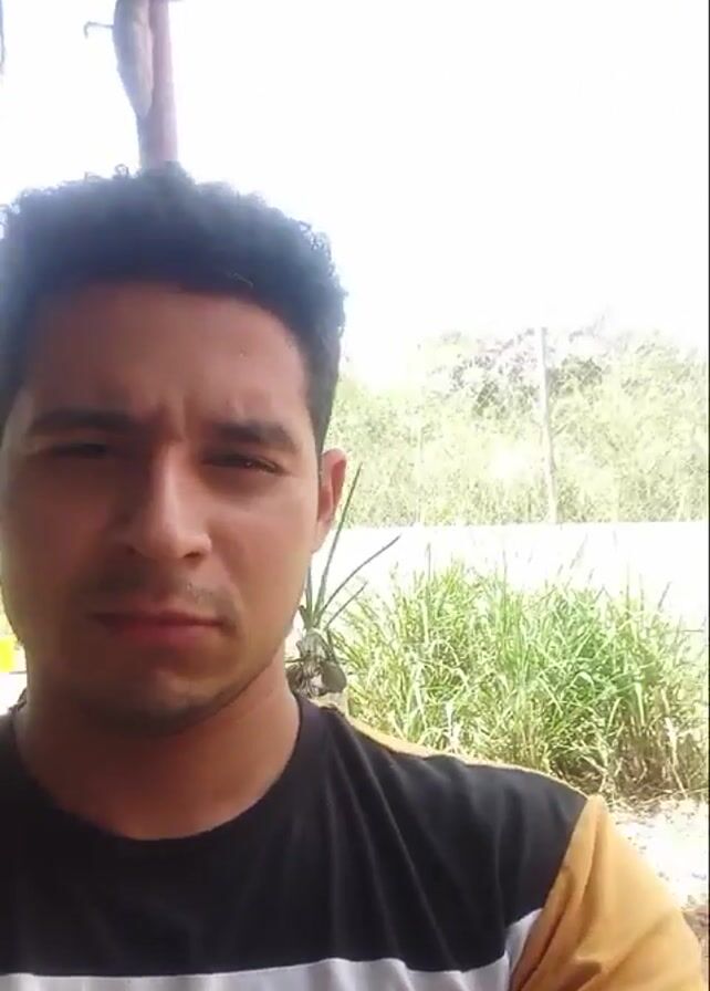 man in a black, white, and yellow Tommy Hilfiger t-shirt. He is outside, possibly in a backyard or garden setting. The background includes vegetation and a structure overhead, potentially a covered porch or pergola. The man initially has a neutral expression, then raises his index finger, and subsequently smiles. The lighting is bright and somewhat overexposed.
