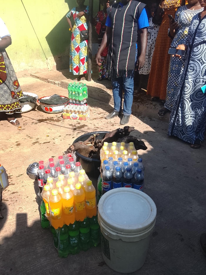The scene depicts an outdoor gathering in Doma, Nigeria, under direct sunlight, indicated by sharp shadows. The ground is an uneven, compacted dirt or concrete surface with damp patches. A light green painted building wall forms the background on the left. Approximately five or more individuals are visible, primarily standing. A male subject in the mid-ground wears a blue short-sleeved shirt beneath a black, striped, fringed sleeveless tunic, blue jeans, and dark shoes. To his left and rear, a female subject wears a multi-colored geometric pattern long dress and a black shoulder bag. On the far right, a female subject in a blue and white patterned long dress is partially visible. No explicit actions or interactions are depicted beyond standing. In the mid-ground, a black plastic basin contains several deceased animals, consistent with small livestock such as goats, which appear dark-furred, possibly singed. Surrounding these items are numerous cases of bottled soft drinks. To the left of the basin, two cases of green-bottled Fanta are stacked above a case of brown-bottled beverages (likely malt drinks). In the immediate foreground, a large stack of transparent plastic bottles includes several cases of orange-flavored soda (Mirinda visible) on top, green-flavored soda (Mirinda visible) in the middle, and dark-colored soda (Pepsi visible) at the bottom. Another stack of Pepsi bottles is positioned to the right of the basin containing the animals. Additional objects include two white enamel basins on the ground to the mid-left, one containing dark material. A small metallic pot with a lid is on the ground near the foreground beverage stack, and a large white plastic bucket with a lid is situated in the lower right foreground.