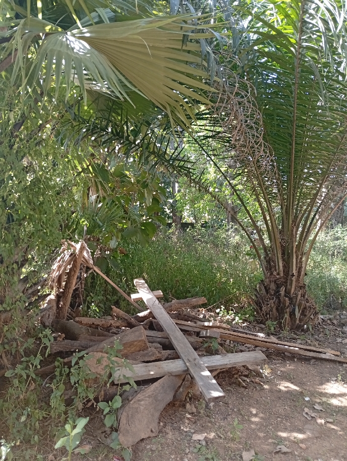 The scene depicts an outdoor, overgrown area in Unguwar Gaya, Nigeria, characterized by dense vegetation and exposed soil. In the upper left, a large, light-colored palm frond extends downwards. To the right, a palm tree with a thick, fibrous trunk and numerous green fronds is visible, bearing dried, curled rachises from former fruit clusters. The background consists of a dense wall of green foliage and tall weeds. In the foreground, a prominent pile of assorted lumber and wood pieces rests on dark brown soil. This pile includes several dark, weathered logs and branches. A lighter-colored, roughly cut wooden plank lies diagonally across the top of the pile, supported by another shorter plank, forming a crude cross-like structure. Smaller green plants and weeds are growing around the base and through the wood pile. The ground is dry earth, partially covered with scattered dry leaves, especially near the palm tree. The area is brightly lit by direct sunlight, indicating daytime conditions. No individuals or animals are present.