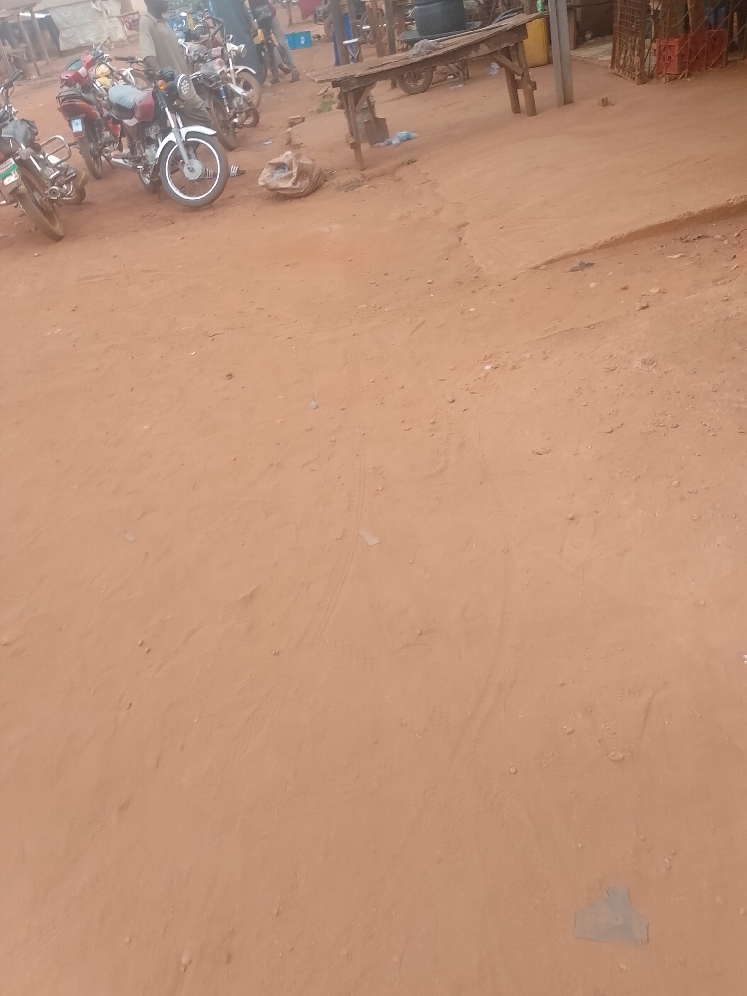 The image depicts a dirt road or open area in Ejule, Nigeria. Several motorcycles are parked on the left side. A wooden table or structure stands in the upper center. Some people are standing near the motorcycles and the table. The ground is dry and uneven. There are some objects and containers in the background.