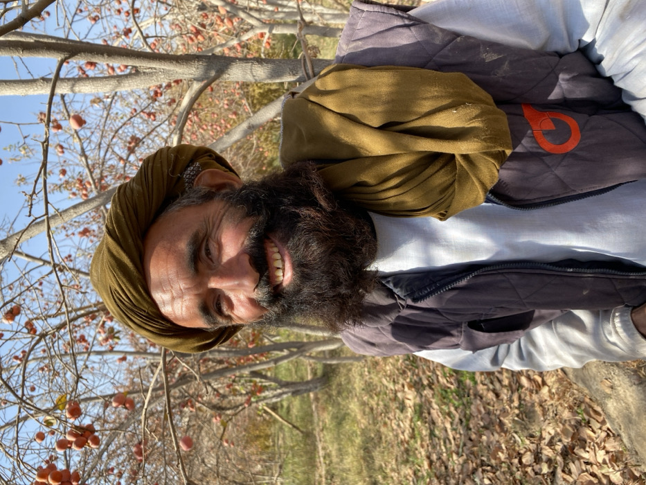 An adult male is depicted in a daytime outdoor setting, identified as an orchard in Bazar-e Panjva'i, Afghanistan