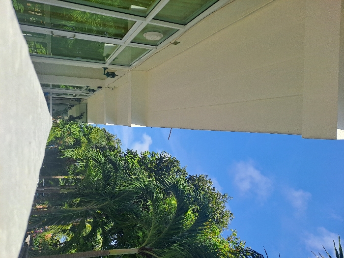The image displays a low-angle view from an elevated concrete walkway or balcony railing, looking outward and slightly upward. To the left, a white, multi-story building facade features a repeating pattern of white-framed glass doors, each equipped with a dark, wall-mounted lantern-style light fixture. Greenish reflections or curtains are visible through the glass, and a white circular fixture is mounted above the leftmost door. The underside of a white concrete balcony or overhang is prominent in the upper left. To the right, a dense array of tropical vegetation, including multiple tall palm trees and other deciduous trees with vibrant green foliage, rises against a clear blue sky featuring scattered white cumulus clouds. Bright natural sunlight illuminates the scene. No individuals, animals, or vehicles are present. The location is Choeng Mon, Thailand.