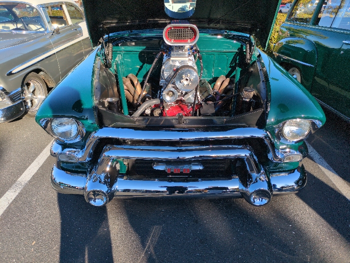 - "The image displays a close-up, front-facing view of a custom teal-green classic car, likely a Chevrolet, with its hood raised to expose a highly modified engine" by FM-w9aT23, licensed under CC BY 4.0