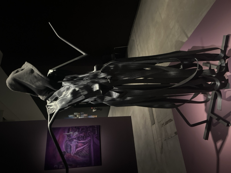 A ghostly figure draped in black ribbons stands in an art gallery. The figure, seemingly hooded, leans towards a painting depicting a grotesque, otherworldly creature. The artwork hangs on a purple wall, contrasting with the gray concrete wall behind it. The scene is partially shadowed, enhancing the eerie ambiance, and the black ribbons create a sense of movement. An angular metal support structure holds the ribbon figure.