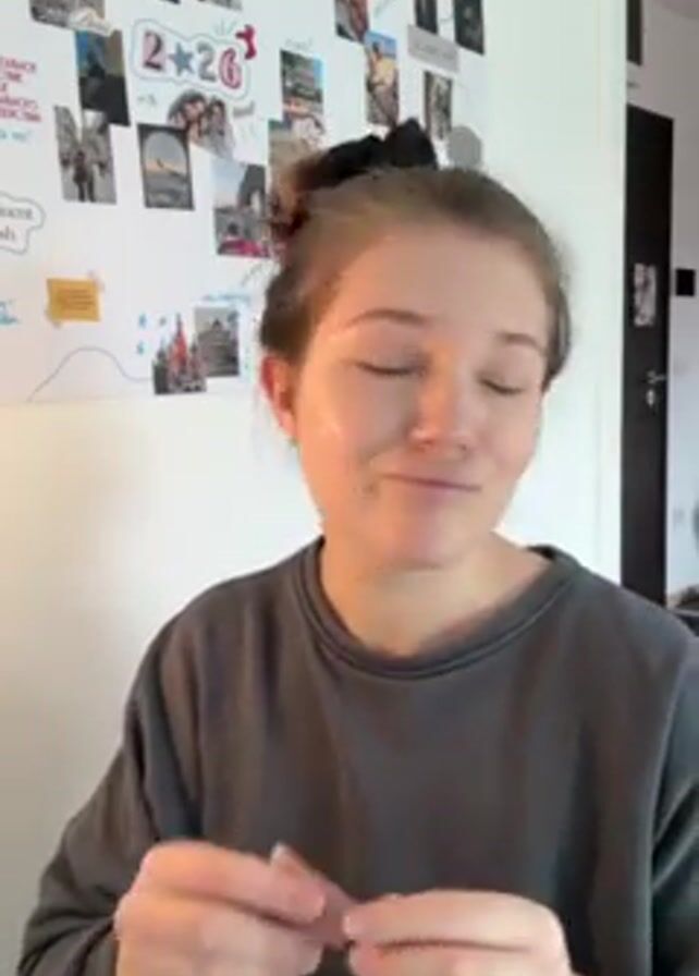 A young woman with fair skin and light brown hair in a bun is standing in front of a white wall adorned with photographs and notes. She wears a gray sweatshirt. She is applying small dots of a red liquid from a bottle with a dropper to her cheek near her eye. She then examines the bottle in her hand and says something in Russian. The background wall displays a collage of images, including photos of the Eiffel Tower, St. Basil's Cathedral, and various people. A dark door is visible on the right side of the frame. Background music is playing.