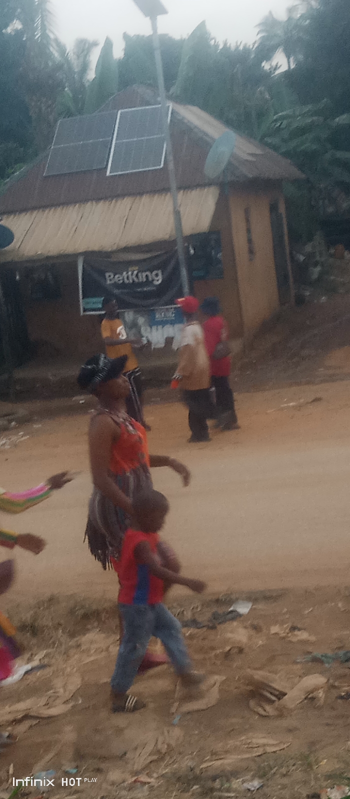 An outdoor shot features people near a building with solar panels. A BetKing sign is visible on the structure. A woman with headwear and a child are prominent figures. Other individuals are blurred in the background, creating a sense of movement. The ground appears uneven and somewhat littered. The image is taken under daylight conditions, though slightly overcast, lending a soft quality to the scene.