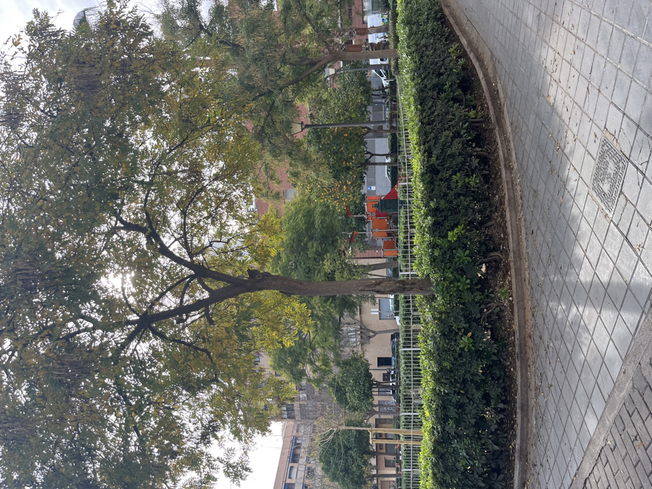 This image depicts a segment of **Plaça de l'Arquebisbe Melià Lloria (also known as Plaça del Professor López Piñero) in Valencia, Spain**, viewed from a paved pedestrian area. In the immediate foreground, a light gray paved pathway with a square tile pattern extends across the bottom, featuring a recessed utility manhole cover on the right. This path borders a dense, dark green hedge of approximately waist height, which forms a curved boundary for an internal park area. Within the midground, a row of mature trees with green and yellowish-green foliage dominates, casting dappled sunlight onto the ground. The central tree is robust, with a thick, dark brown trunk and a wide canopy displaying numerous long, hanging seed pods. Behind the hedge and trees, a white metal fence or railing separates the inner park from an adjacent street. Visible within the park area is a children's playground structure, characterized by bright orange, red, and green components including slides and climbing elements. Several smaller trees, some laden with ripe, orange fruit, are interspersed throughout the park. A black urban streetlamp with a single luminaire is positioned on the right. Beyond the park, on a street, several vehicles, including dark cars and a white van, are parked or in motion. The background consists of multi-story urban buildings. On the far left, a light-colored building with multiple balconies or windows is prominent, distinguished by horizontal blue elements, possibly awnings or railings. Further right, a brick-colored building is partially visible through the tree canopies. The sky, partially obscured by the tree cover, appears bright, indicating a daytime scene with diffused sunlight. No individuals are present or engaged in any activity within the frame.