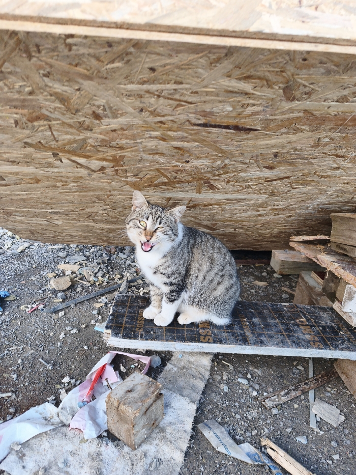 In Zlatitsa, Bulgaria, a grey and brown tabby cat with white fur on its chest, belly, and paws is positioned centrally in an outdoor setting. The cat is seated upright on a dark, rectangular board featuring a grid pattern and fragmented text. Its mouth is open, exposing its tongue, and its left eye is partially closed, while the right eye is fully open. The board is elevated above uneven ground composed of dirt, gravel, and scattered debris including plastic remnants (white and pink) and a rough-hewn wooden block. The background consists of a large, light-colored wall constructed from Oriented Strand Board (OSB) panels. To the immediate right of the cat, additional stacked wooden planks and general refuse are visible on the ground. The scene is illuminated by natural daylight.