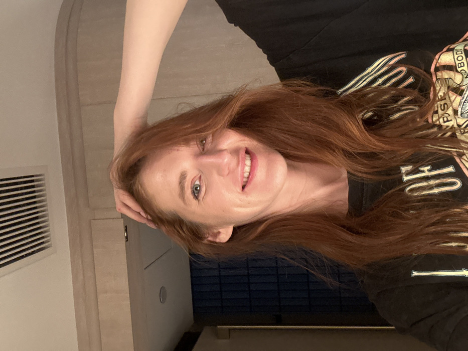 A woman with red hair smiles, looking at the camera. She wears a black t-shirt with graphic design, appearing to be in an indoor setting with a wall and ventilation grates visible. Her left hand rests on her head. The photograph is rotated at an odd angle.