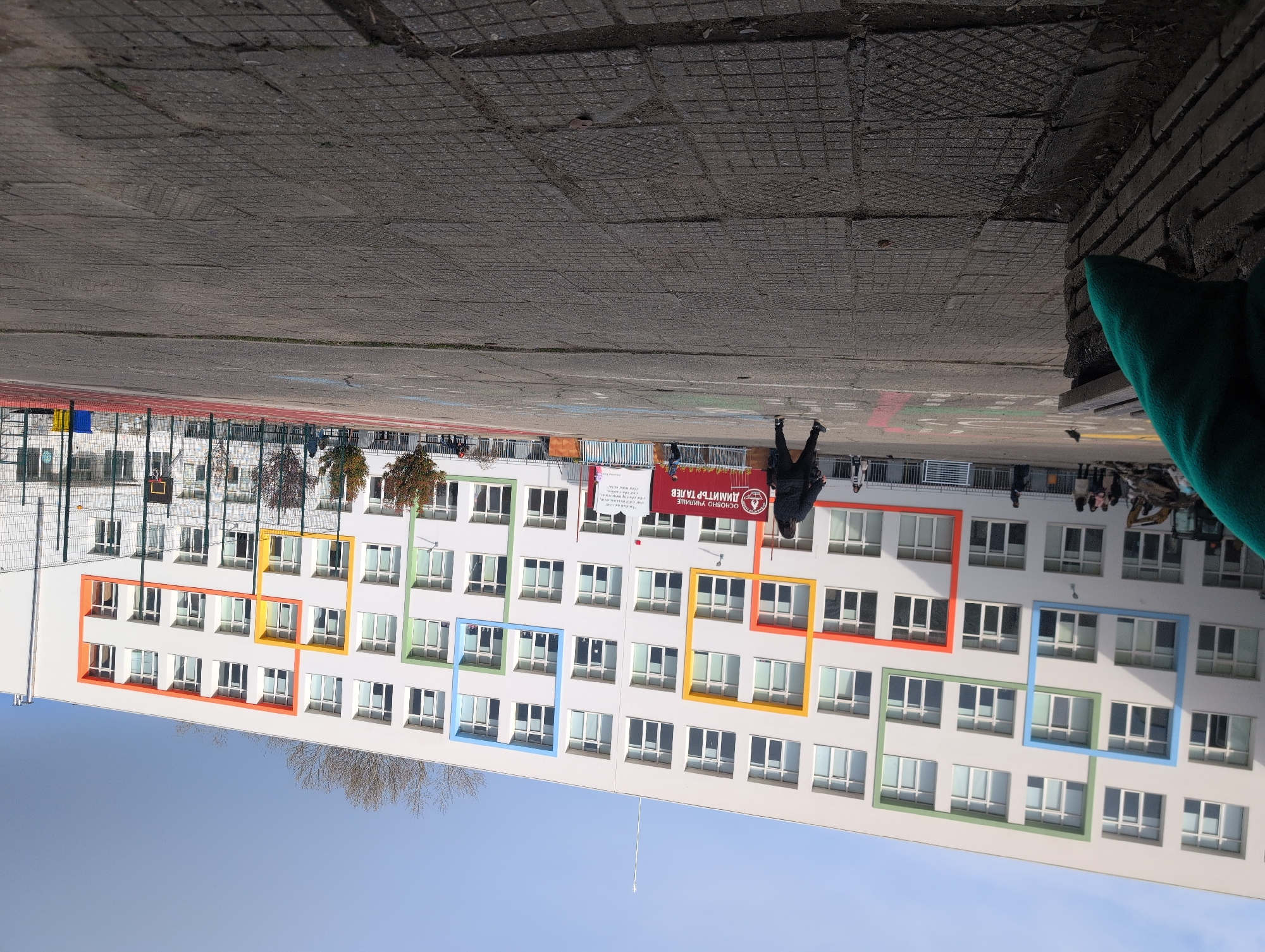 A building with a white facade and windows outlined in colorful squares (red, orange, yellow, green, and blue) is visible. There are people walking in front of the building, and a sign with red text is displayed on the building. The location is Plovdiv, Bulgaria. The ground in front of the building appears to be paved with concrete tiles.