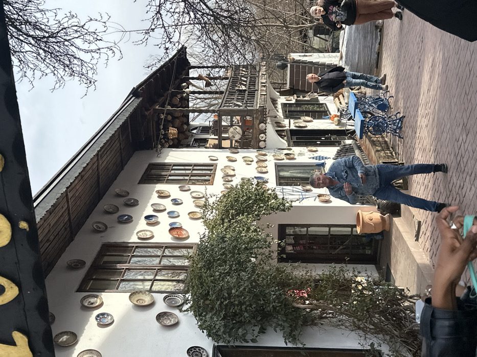 The image displays an outdoor scene in Horezu, Romania, centered on a two-story white building adorned with numerous decorative ceramic plates of various sizes and colors affixed to its facade. The building features dark-framed windows and a prominent wooden balcony on the second floor, which has an ornate wooden railing and displays hanging ceramic objects and baskets. A large green leafy vine partially covers the ground floor entrance on the left. The ground in the foreground is paved with reddish-brown interlocking bricks. Four individuals are visible. In the bottom left foreground, a person's dark-skinned right hand and forearm, clad in a black sleeve, holds a light blue object. Centrally, a man wearing a blue denim jacket and jeans stands, gesturing with his right hand while holding a small item. To his right and further back, another man in a black jacket and blue jeans stands, looking towards the left. Adjacent to him on the right, a woman in a dark hoodie and brown pants stands, holding an object with both hands and also looking left. Two blue metal tables with ornate bases and a long wooden bench are positioned on the paved area to the right of the central man. A large terracotta pot rests near the ground floor entrance on the left. The background reveals bare deciduous trees against a light blue, slightly overcast sky.