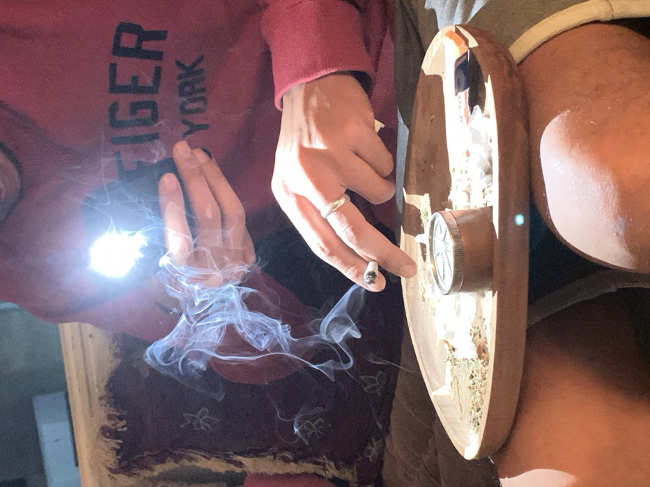 A person wearing a pink sweater holds a lit joint with smoke emanating from it. In the other hand, they hold a flashlight. Beside them is a wooden tray with a metal grinder attached, containing leafy material. The scene is bathed in light, reflecting off the skin and objects. The setting suggests an indoor environment.