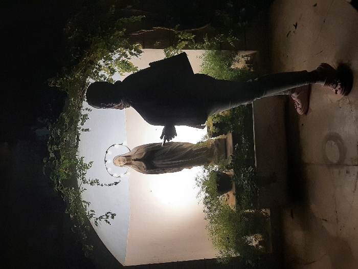 The image depicts a nighttime scene within As-Salihiya Municipality, Syria, centered on a religious statue and a single individual. A light-colored statue, likely of the Virgin Mary, stands prominently within a white, arched grotto. The statue, rendered with hands clasped in prayer and a draped garment, is intensely illuminated from behind and below, creating a bright glow and a halo-like effect from a circular light fixture positioned behind its head. Green vegetation, including potted plants, surrounds the base of the statue, and vines are draped over the exterior of the arched grotto. In the mid-ground, a person is positioned with their back partially to the camera, largely silhouetted against the brightly lit grotto. The individual wears a dark top or jacket, light-colored pants, and pink, platform-style shoes. A dark scarf or head covering is visible. The person's left hand holds a small, dark object, possibly a mobile phone. The ground in the foreground is paved with light-colored flagstones or tiles, displaying faint circular markings. The overall environment is dark, consistent with a nighttime setting, with artificial light primarily focused on the statue.