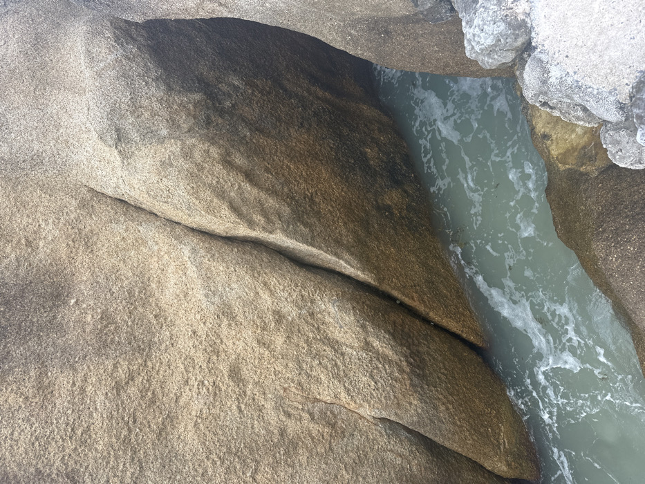 A high-angle shot captures a narrow channel of water flowing between large, weathered rocks. The rocks are predominantly brown and tan, with varied textures, smooth in places and coarse in others. The water appears light blue-green, churned with white foam, and reflections are visible on its surface. The rocks form natural barriers, guiding the flow of water through the constricted space.