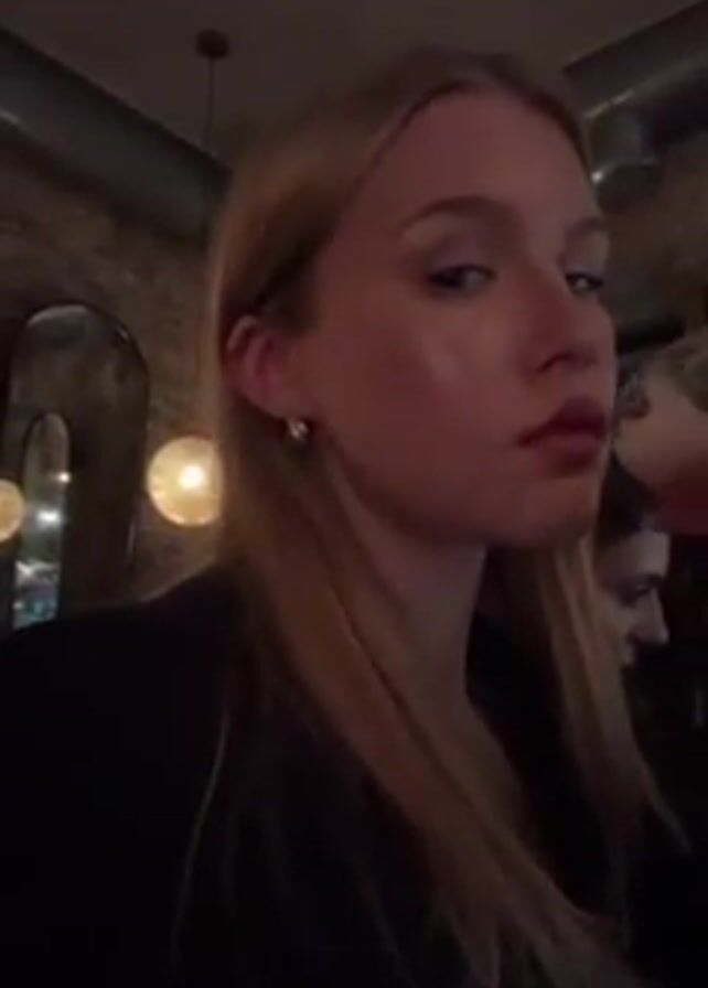 A woman with long blonde hair is taking a sip from a cocktail in a dimly lit bar. The woman is wearing a black jacket and small hoop earrings. The drink she is consuming is in a large, bulbous glass and appears to be pinkish. Behind her is another woman with dark hair. The background of the scene reveals an exposed brick wall, decorative lights, and mirrored elements.