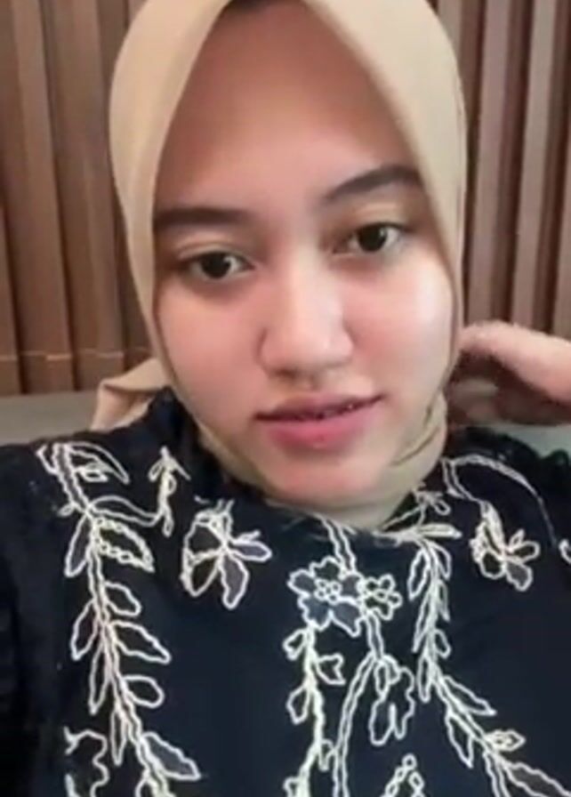 A woman with fair skin, wearing a hijab and braces, looks directly at the camera. She is wearing a black blouse with white and gold floral embroidery. She initially has a neutral expression, then smiles broadly, displaying her braces. She purses her lips slightly at the end of the clip. The background consists of vertical wooden panels. The scene is well-lit.