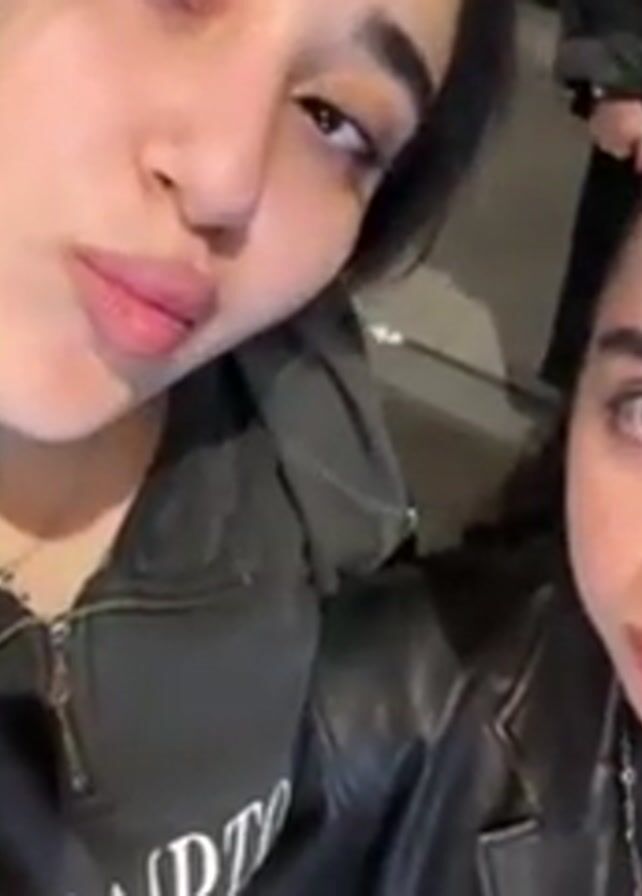 Two young women are standing outside, posing for a selfie-style video. The woman on the left has long blonde hair with darker roots and is wearing a black zip-up sweatshirt and a delicate gold necklace. The woman on the right has dark hair pulled back from her face and is wearing a black leather jacket and a silver chain. They are both looking at the camera with slightly pouty expressions. The woman on the right briefly sticks out her tongue. In the background, there are blurred figures of people walking, a car, and streetlights. The overall lighting suggests it is evening.