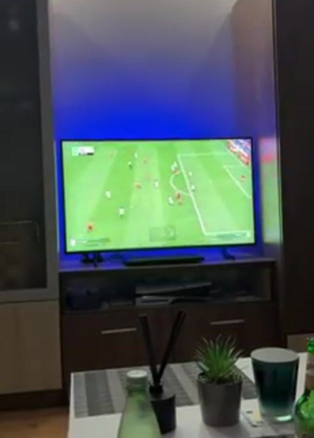 A stationary camera records a room with a TV playing a soccer video game. The TV is built into a brown entertainment center with blue lighting around the screen. In front of the TV is a coffee table with a gray and white patterned top. On the table, there are several objects, including a green glass bottle of water, a black air freshener, a small potted succulent, a glass tumbler with a dark liquid, a smartphone, a black TV remote, and a green bottle of liquor. The camera captures the living room, focusing on the TV and the items on the coffee table. The video game displayed on the TV shows an active soccer match with players in red and white uniforms. The room is dimly lit, with the blue lighting from the TV providing some ambient illumination.