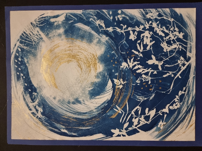A rectangular print displays a swirling blue and white design, accented with gold. The left side features a prominent golden circular shape. Flowing brushstrokes create a dynamic motion across the surface. Delicate white branches with leaves extend from the right side, adding an organic element. Scattered golden dots are interspersed among the branches. The print is mounted on a blue cardstock.