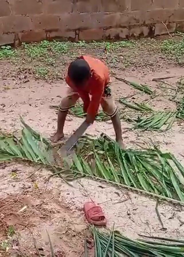 A barefoot child in an orange long-sleeved shirt and patterned shorts is chopping a long green palm frond on a dirt ground with a machete