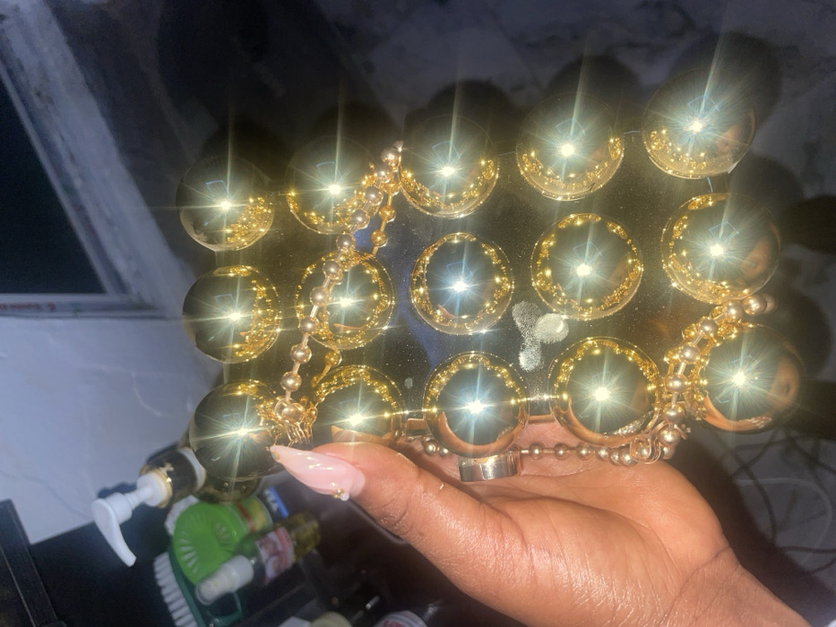 A gold metal tray containing twelve spherical indents reflects light. A gold beaded chain embellishes the tray's edge. A manicured hand with a pale pink nail holds the tray. In the background, a soap dispenser and cleaning supplies are visible. The tray's surface shows a fingerprint smudge. The scene is bathed in bright light, creating starburst reflections.