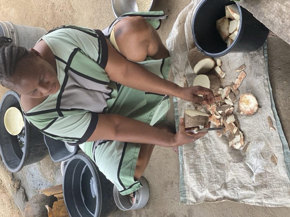 In an outdoor setting in Adankolo, Nigeria, an adult female squats barefoot on a light-colored woven tarp laid over dirt ground, actively peeling yams