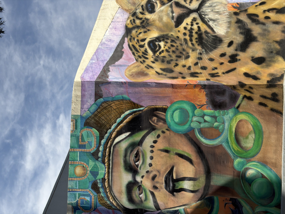 A building mural shows an Aztec-like figure with green face paint, wearing a woven headdress and large, round, teal-colored earrings. Beneath the figure, there are geometric Aztec patterns. Above the figure, a large leopard head looks down. The sky with scattered clouds is visible to the left. The mural has vivid colors with a mix of historical and natural themes.