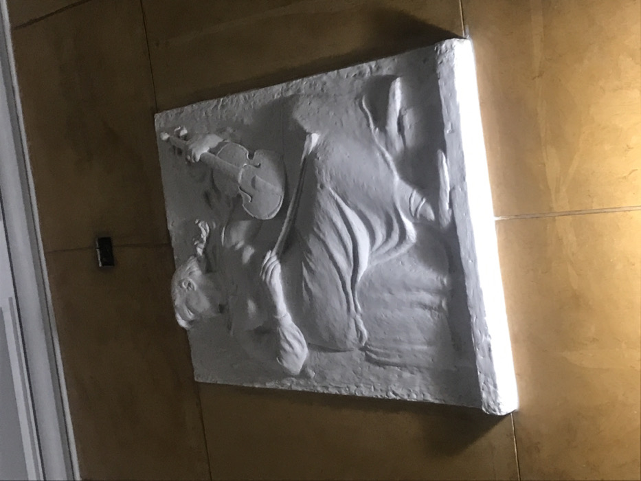 white plaster relief of a figure playing a violin, mounted on a beige tiled wall