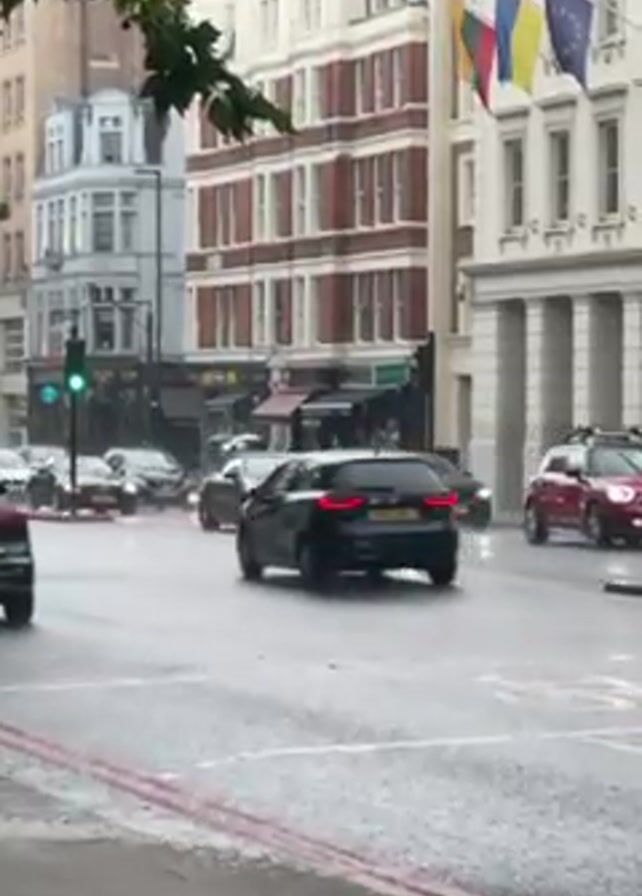 street scene in London on a rainy day. Several cars are visible, driving through an intersection with wet pavement. The traffic light is green. Buildings line the street, with flags flying from one of them. A tree branch is in the upper left corner.