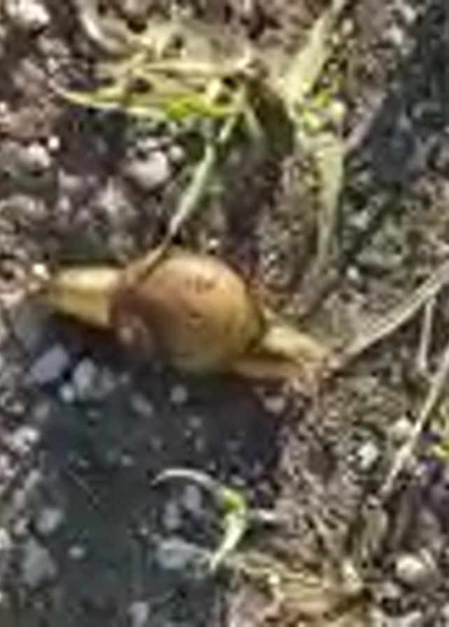 snail slowly moving across a patch of ground. The ground is a mixture of dirt, small rocks, and sparse green grass. The snail has a brown shell and a yellowish body. Its antennae are extended as it navigates the terrain. In the upper right corner of the frame, there is a small, white object, possibly a piece of shell or debris. The focus is primarily on the snail and its slow progress across the ground.