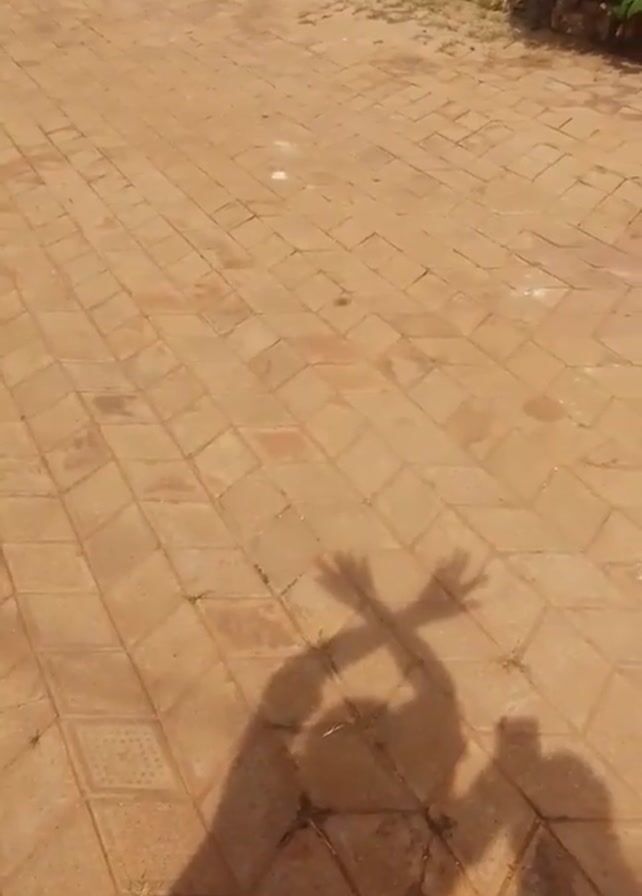 brick-paved area outdoors on a sunny day. A shadow of two people is visible, with one person's hands raised. The bricks are reddish-brown and arranged in a pattern. Along the top of the frame, there is a strip of soil and some sparse vegetation.