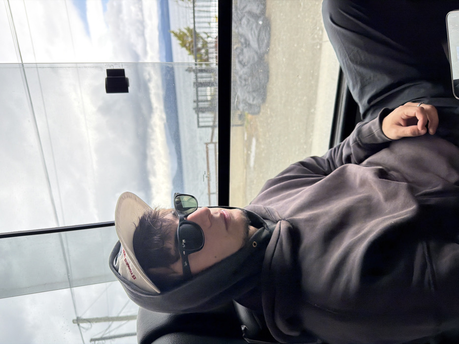 A person wearing a beige baseball cap and black sunglasses reclines against a bus window, with a scenic view of water and distant land. The individual is clad in a dark grey hooded sweatshirt and dark-colored pants. The bus window shows reflections and a glimpse of the landscape. Part of a smartphone is visible above the person's right arm, suggesting someone took the photo. The image appears to be taken indoors.