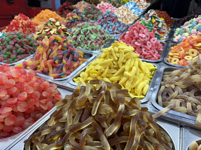 - "The image displays a detailed view of a large assortment of gummy candies arranged in multiple metal trays, likely within a market stall or store in Tel Aviv, Israel" by FM-kvEG43, licensed under CC BY 4.0