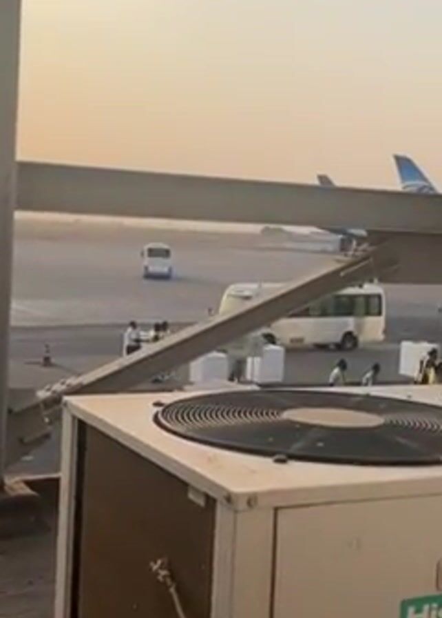 view of an airport tarmac from an elevated position, possibly a building rooftop. The focus is on an air conditioning unit with the Hisense brand visible. In the background, there are several buses parked on the tarmac, along with personnel dressed in safety vests. Two airplanes with blue tail markings can be seen in the distance. The lighting suggests either dawn or dusk. The scene appears static with minimal movement.
