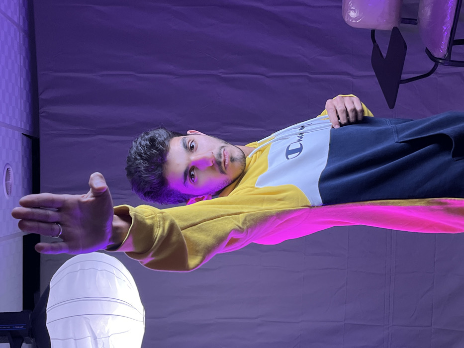 A young man with dark hair and a goatee extends his hand towards the viewer. He wears a yellow, white, and navy Champion hoodie. The background is a purple/gray draped fabric. A white spherical light is visible to the left. The lighting is a mix of white and pink. The image is oriented sideways.