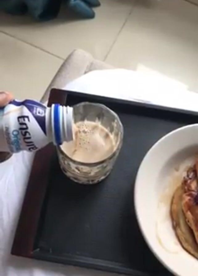 A person is pouring Ensure Original nutritional drink into a glass on a black tray. Next to the glass is a white plate with pancakes. The tray is on top of a white bed sheet. In the background, there is a blue velvet blanket and a white curtain.