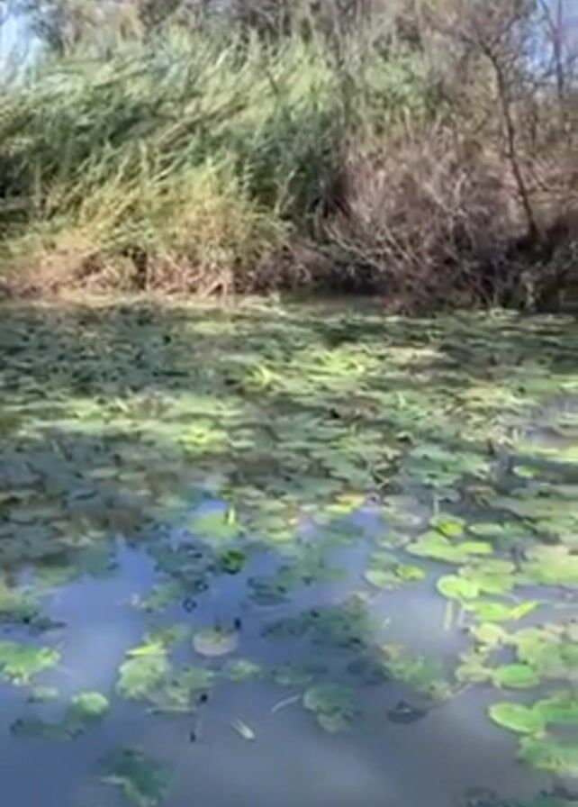 body of water covered with lily pads. The water is murky, and reflections of the sky can be seen between the lily pads. The water is surrounded by trees and reeds, with some of the trees having bare branches. The sky is blue. There is no visible human presence. The video appears to be shot from a boat or other floating device.
