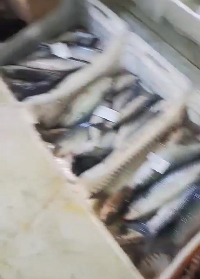 fish market, where multiple people are gathered around boxes containing fresh fish. The fish are mostly silver in color and appear to be of similar size and shape. The people are dressed in casual clothing, and some are seen inspecting the fish. The environment is brightly lit and appears to be a commercial space with tiled floors and brick pillars. The video seems to capture the activity of a typical fish market, where buyers and sellers are interacting to trade fresh seafood.