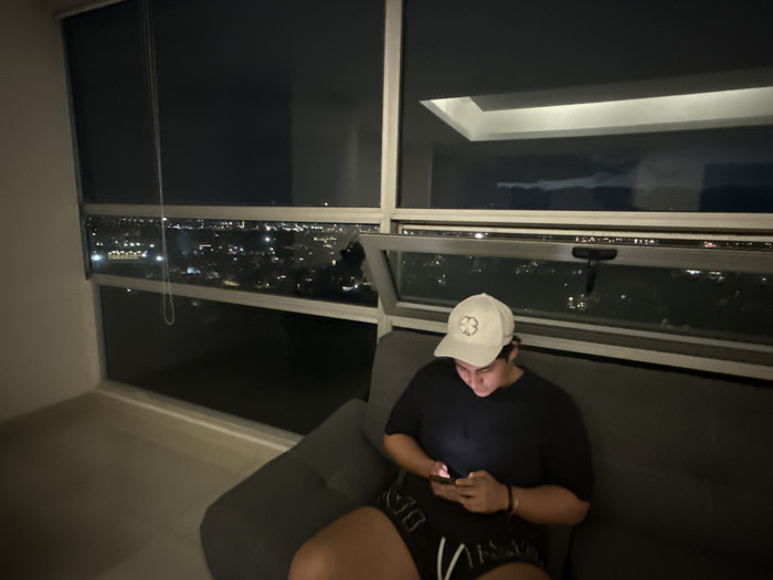 The image displays an indoor night scene from a high-rise building overlooking the city of Puebla, Mexico. A single individual, a young adult male, is seated on a dark gray sofa in the foreground. He wears a light-colored baseball cap with a four-leaf clover emblem, a dark t-shirt, and dark shorts. He is actively engaged with a smartphone, holding it with both hands and looking down at its illuminated screen, which casts light onto his face and hands. Behind the individual, large windows extend across the background, offering a panoramic view of Puebla City at night, characterized by a vast expanse of distant artificial lights from buildings and streets. Dark roller blinds are partially drawn from the top of the windows, and a white pull cord hangs visibly on the left. The room is dimly lit, with ambient light primarily originating from the smartphone screen and the cityscape outside. The visible flooring on the left is light-colored.