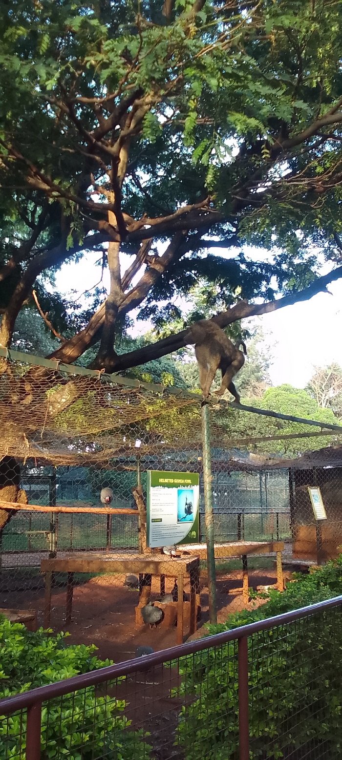 The scene depicts an outdoor animal exhibit in Athi River ward, Kenya. A large tree with abundant green foliage and prominent branches dominates the upper frame. A baboon is observed standing on a horizontal wooden beam, part of an enclosure structure, positioned beneath a tree branch. The baboon faces right, its back towards the viewer. Below, a wire mesh enclosure contains multiple Helmeted Guineafowl; one is perched on a wooden structure, while others are visible on the reddish-brown earth floor. A green informational sign, prominently displaying "HELMETED GUINEA FOWL" and an image of the bird, is affixed to the mesh fence. Wooden shelters are situated within the enclosure. In the foreground, a dark red railing runs horizontally, bordered by dense green shrubbery. No human individuals are visible.