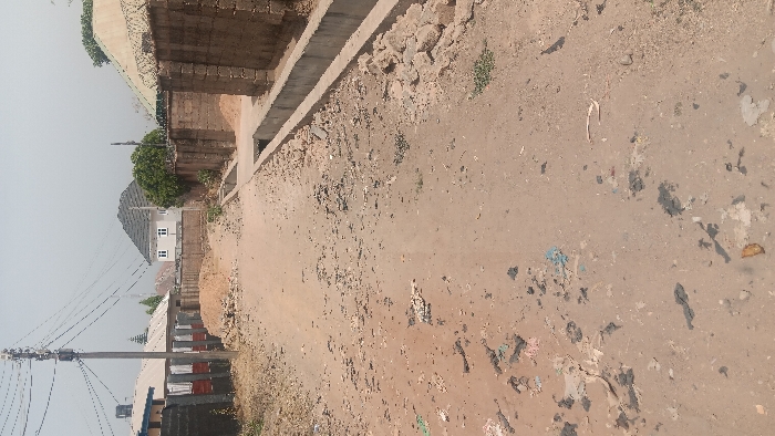 The image displays an unpaved, reddish-brown dirt road in a residential area of Jos, Nigeria, under a hazy, bright sky. The road surface is irregular, marked by scattered debris including small rocks, broken concrete fragments, light and dark plastic litter, and irregular dark stains. On the left side of the foreground, sparse dry vegetation is visible. A prominent wooden utility pole, equipped with multiple overhead wires, stands in the midground to the left. Behind it, block fences and the corrugated metal roof of a single-story structure are partially discernible. A low pile of reddish-brown sand and rubble is present on the left shoulder of the road further back. In the background, a two-story residential building with white walls and a dark gray gabled roof is prominent, flanked by other structures. On the right side of the road, a concrete drainage channel runs parallel to the dirt path. Alongside this channel, a low barrier of stacked rocks and concrete debris is present. Behind this, a tall block wall, topped with what appears to be security wire, encloses a property. Sparse, dry vegetation also appears on the right edge. No individuals or vehicles are visible in the scene.