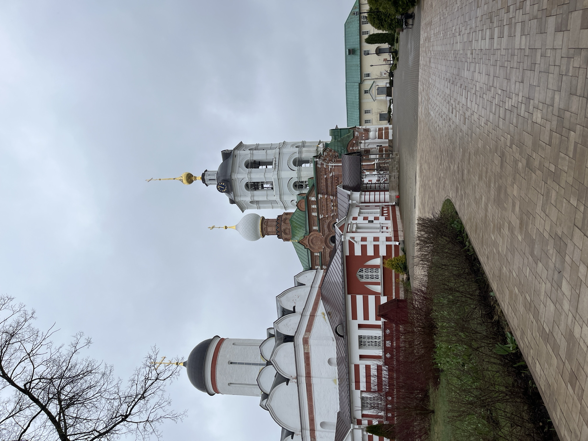 view of architectural structures in Луговой, Russia, under a cloudy sky. The structures include buildings with red and white painted exteriors, golden domes topped with crosses, and a white bell tower with a clock face. A brick-paved walkway is visible in the foreground, alongside green and reddish shrubbery. Leafless tree branches are seen on the lower left of the image. A light green building is situated further back in the scene. No people are visible in the image.