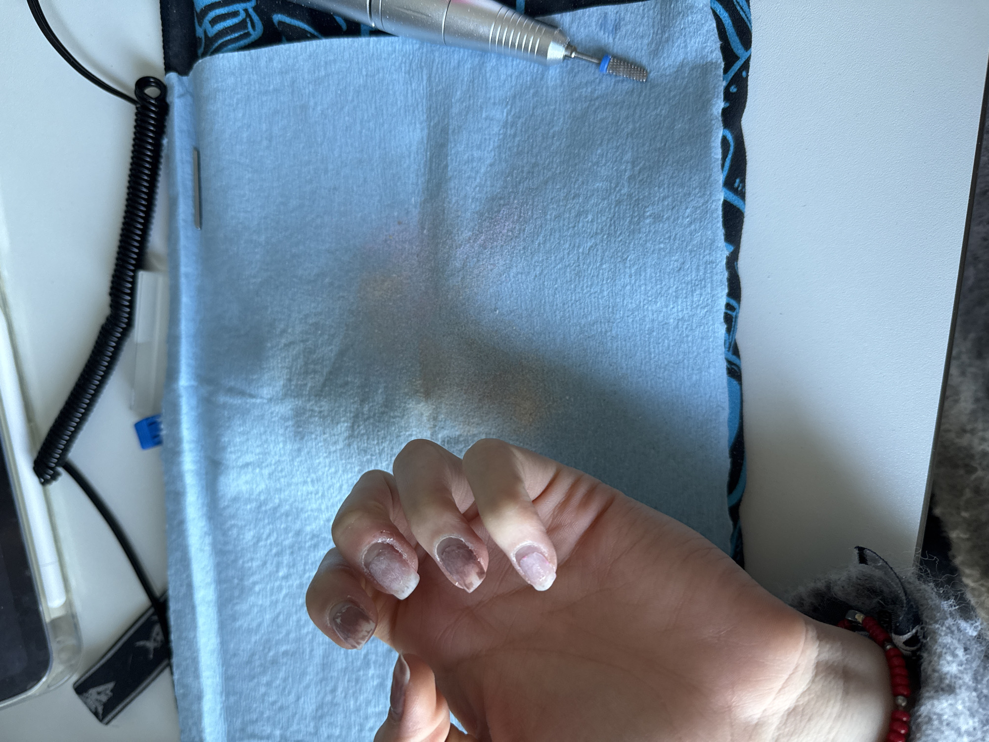 The scene, located in Hull, United Kingdom, displays a close-up, elevated perspective of a human left hand positioned on a light blue disposable mat. The fingernails of the index, middle, ring, and pinky fingers show partially removed nail product, exposing areas of the natural nail plate. Brownish-red discoloration is visible beneath the middle and ring fingernails. The mat is soiled with fine, pale pinkish-white dust, consistent with nail filing debris. To the right of the mat, a silver electric nail drill, fitted with a blue-collared bit, is positioned vertically. In the upper left background, portions of a white electronic device, a white stylus, and a black coiled cable are visible, alongside a small blue plastic object. A black fabric with blue geometric patterns is visible beneath the disposable mat. The individual's wrist features a red beaded bracelet, and a grey, textured garment is partially observed at the bottom left. The objects are situated on a white, textured surface.